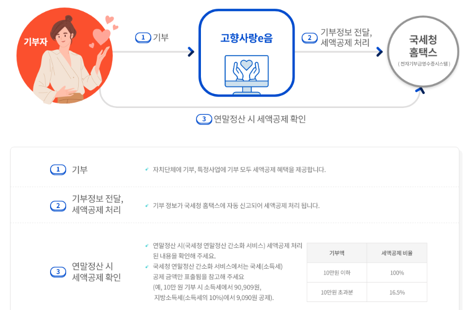 기부한 다음 해에 연말정산이나 종합소득세 신고할 때 세액공제를 받을 수 있어요. 기부 영수증은 '고향사랑 e음' 사이트에서 출력할 수 있습니다.