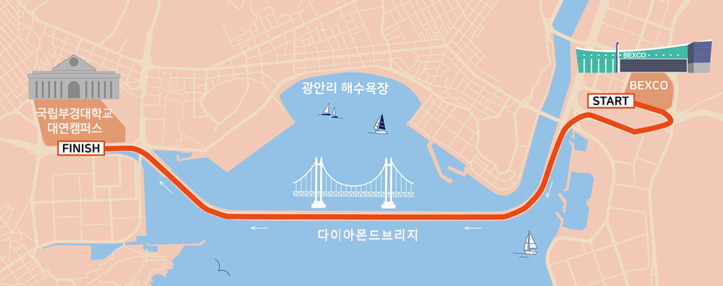 | 장소 | 벡스코 광장 → 광안대교 → 국립부경대학교 대연캠퍼스 대운동장 |