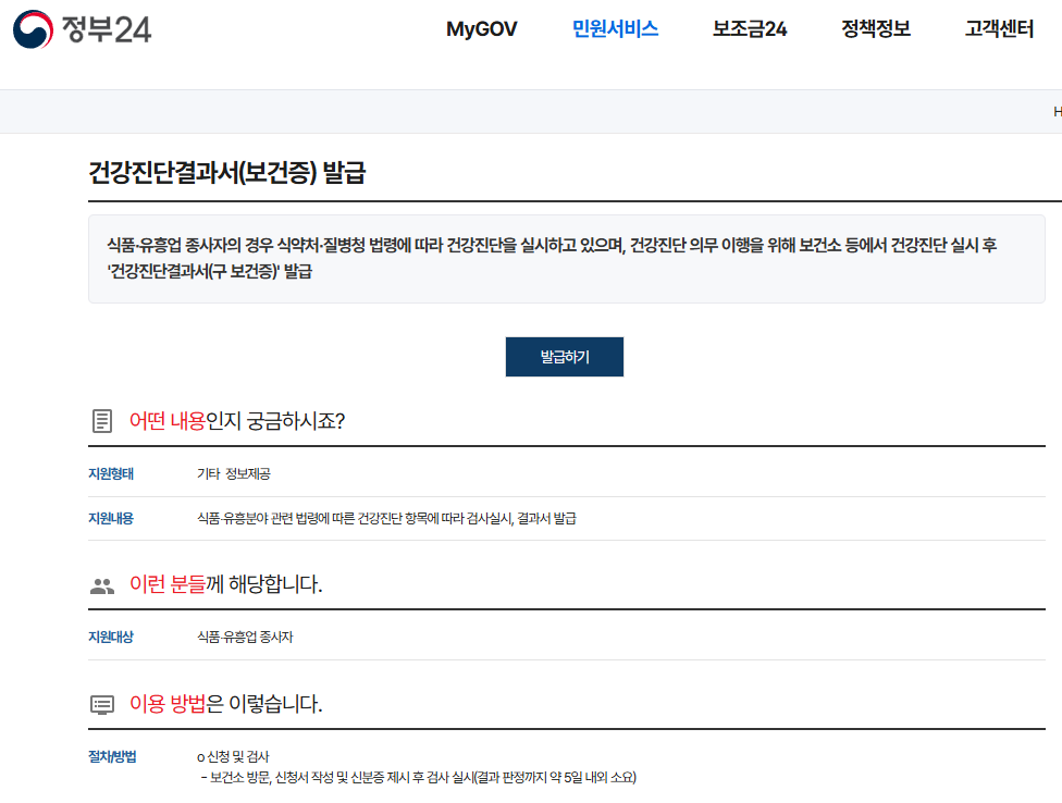 - 인터넷 발급이 불가능한 경우, 직접 보건소에서 발급받아야 합니다.