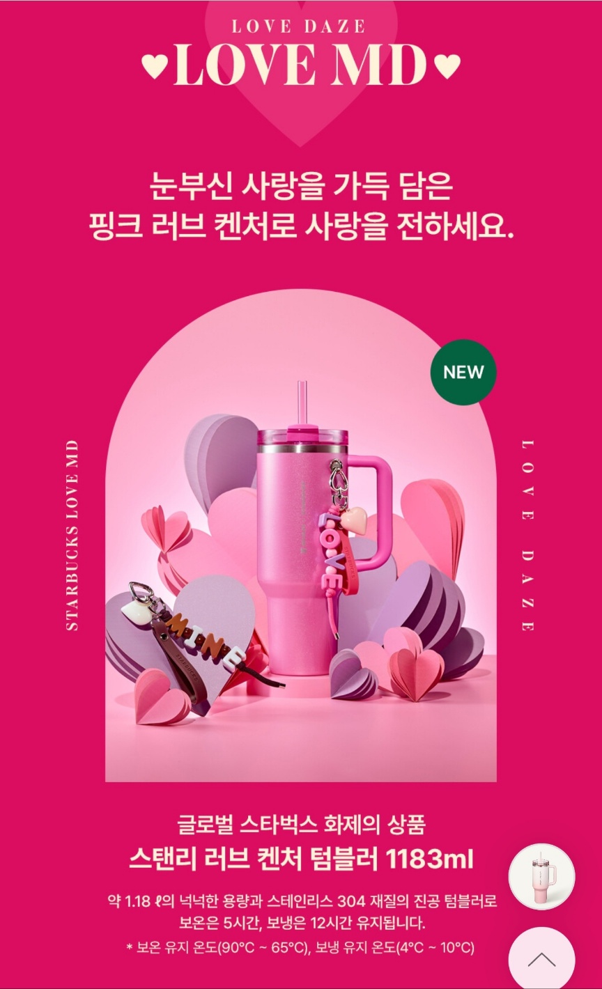그 영화를 보고 있는데 문득 스타벅스 한정판 텀블러가 생각났어요. 화이트데이 맞이 '러브 데이즈(LOVE DAZE)' 프로모션으로 선보인 'SS 스탠리 러브 켄처 1183ml 텀블러'가 바로 그것! 미국에서는 이미 품절 대란을 일으켰던 그 텀블러가 드디어 한국에 상륙했거든요.