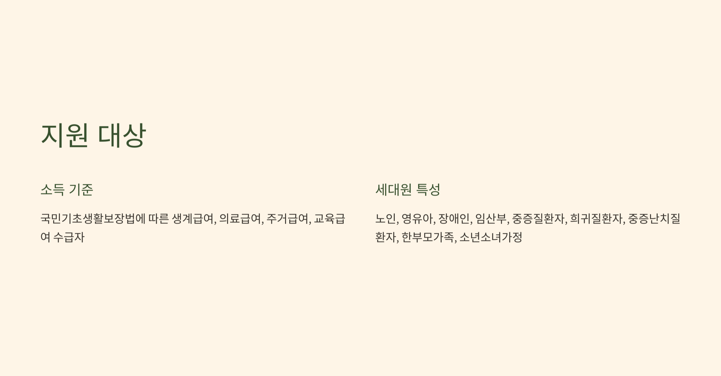 - 소득 기준: 국민기초생활보장법에 따른 생계급여, 의료급여, 주거급여, 교육급여 수급자