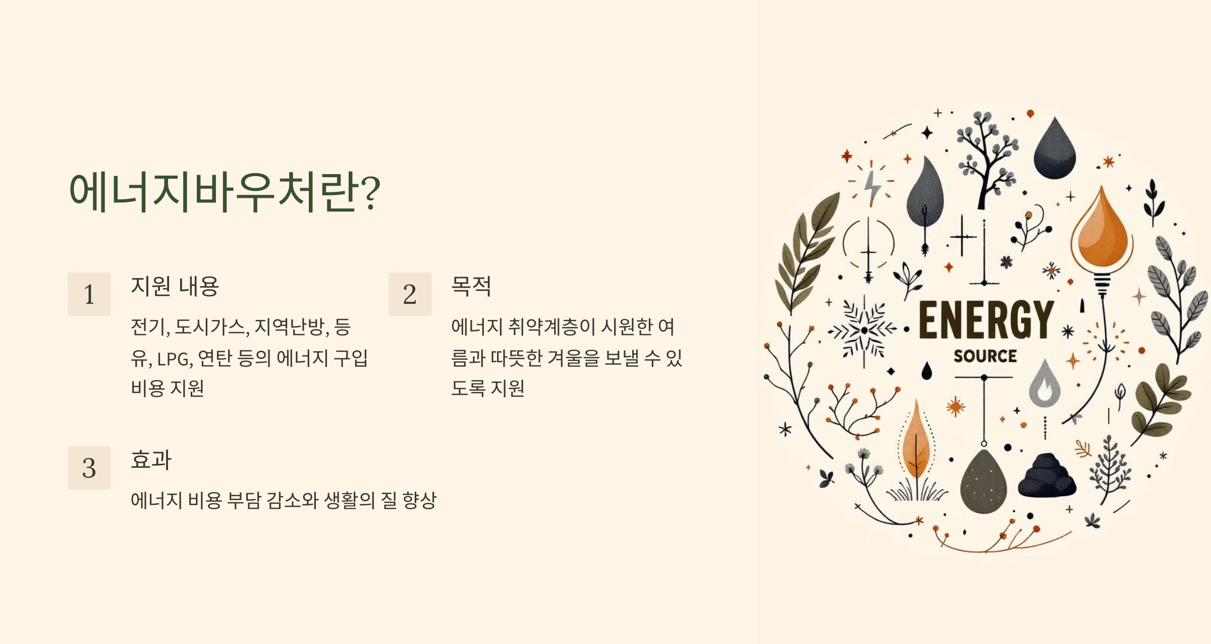 에너지바우처는 에너지 취약계층이 시원한 여름과 따뜻한 겨울을 보낼 수 있도록 전기, 도시가스, 지역난방, 등유, LPG, 연탄 등의 에너지를 구입할 수 있도록 지원하는 제도입니다.