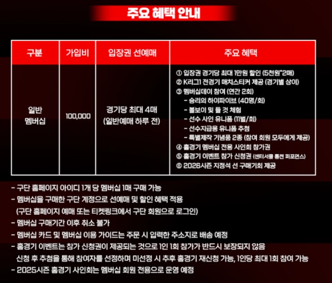 - 멤버십 혜택은 2025 시즌 K리그 1, 코리아컵, ACL 홈경기에서 모두 사용 가능합니다.