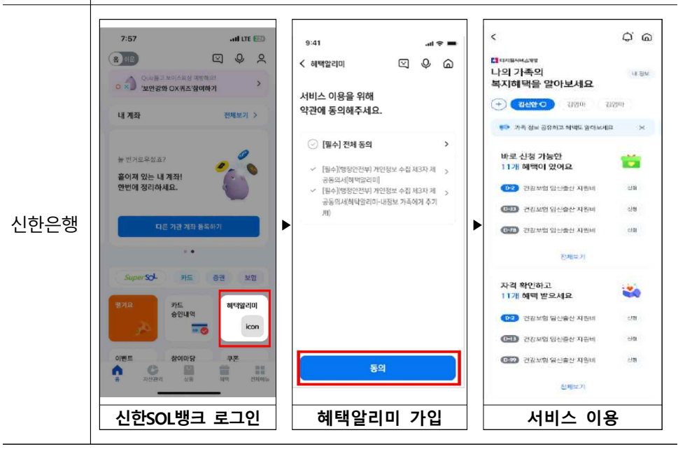 | 신한은행 SOL 앱 | 검색창 '혜택알리미' 검색 → '시작하기' 클릭 → 약관 동의 및 개인정보 입력 |