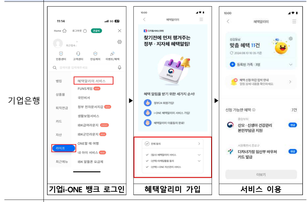 기업은행 i-ONE Bank 앱 [라이프] 탭 → [혜택알리미 서비스] 클릭 → 약관 동의 및 가입