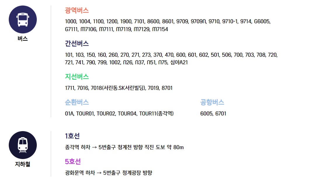- 버스: 광화문 또는 종로 방면 버스 이용