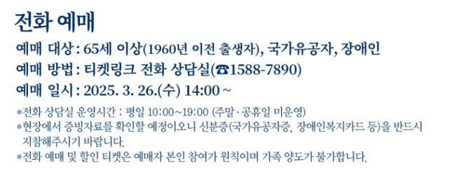 - 잔여석 일반 예매: 3월 26일(수) 14:00부터 선착순