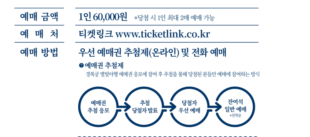 예매는 티켓링크를 통해 진행되며, 1인당 최대 2매까지 구매 가능합니다. 가격은 1인 60,000원으로, 궁중 문화 체험과 국악 공연이 포함되어 있어요.