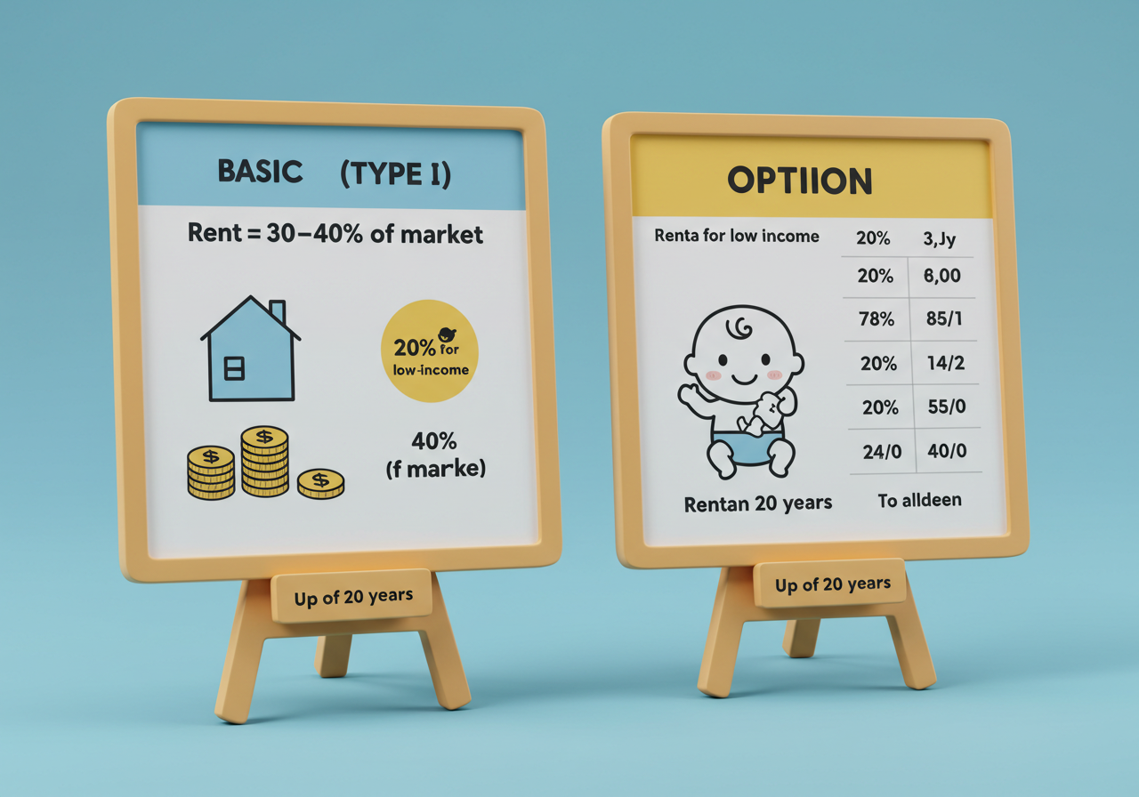 II유형은 일명 준전세형이에요. 월세가 거의 없거나 적고, 보증금 중심으로 구성돼 있어서 거주 안정성이 좋아요. 임대료는 시세의 70~80% 수준이며, 자녀가 있으면 최대 14년까지도 거주 가능해요.