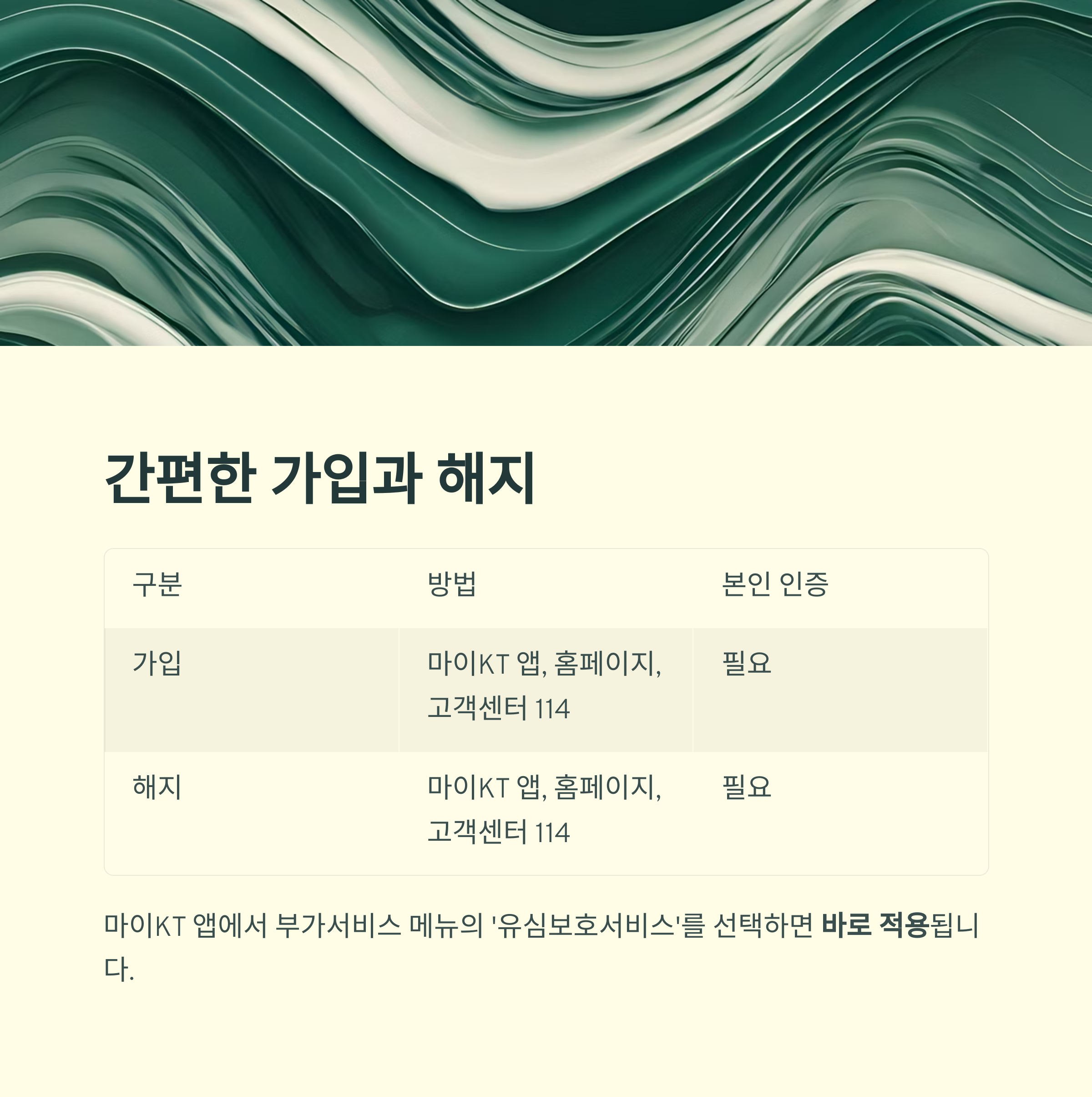 가입 절차는 간단합니다. 마이 KT 앱 실행 후 부가서비스 메뉴에서 ‘유심보호서비스’를 선택하면 바로 적용되며, 필요시 언제든지 해지 후 재가입할 수 있어 유연하게 활용 가능합니다.