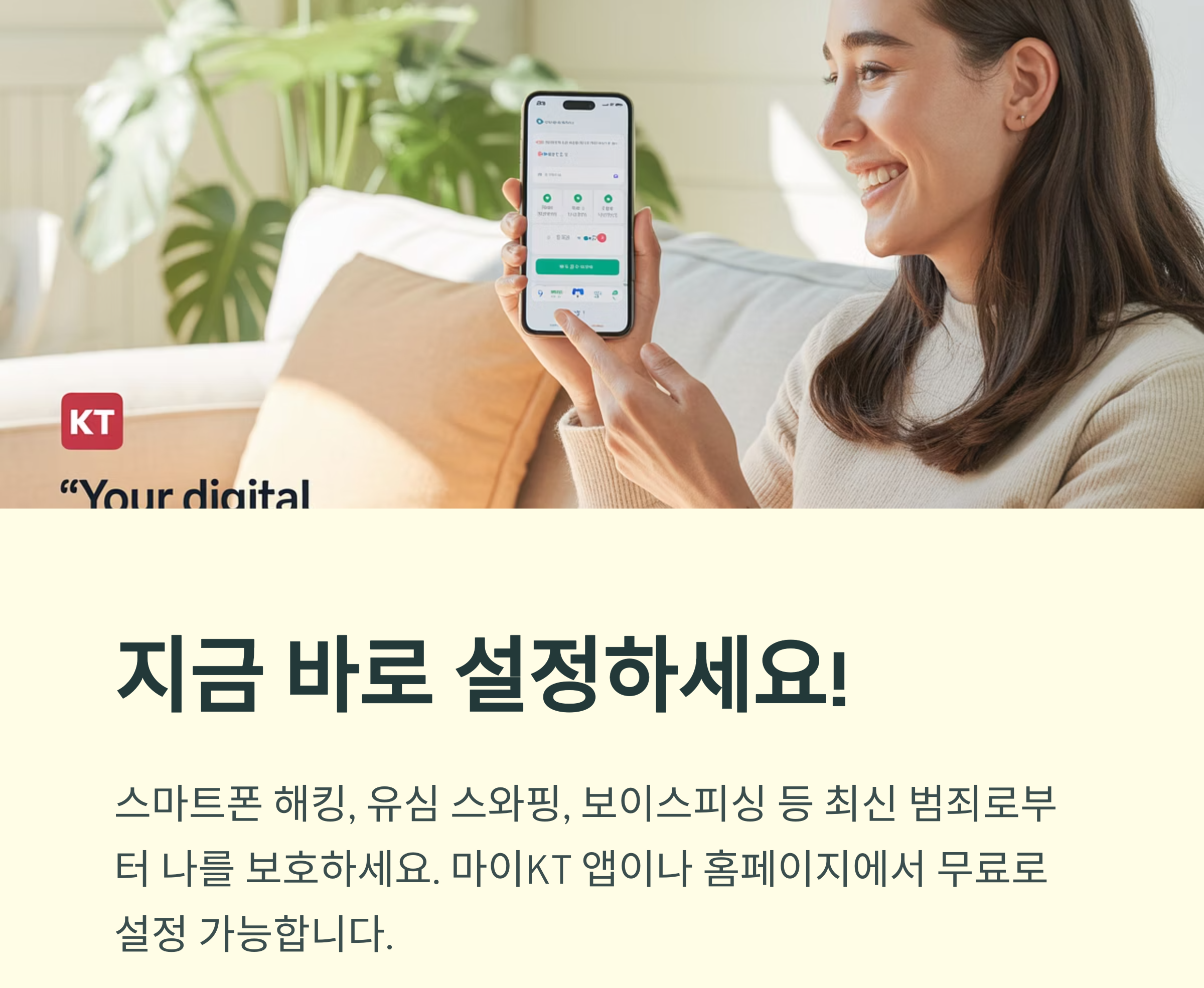 스마트폰 해킹, 유심 스와핑, 보이스피싱 등 최신 범죄 유형에 맞서기 위해 지금 바로 마이 KT 앱 또는 KT 홈페이지에서 유심보호서비스를 설정하세요.