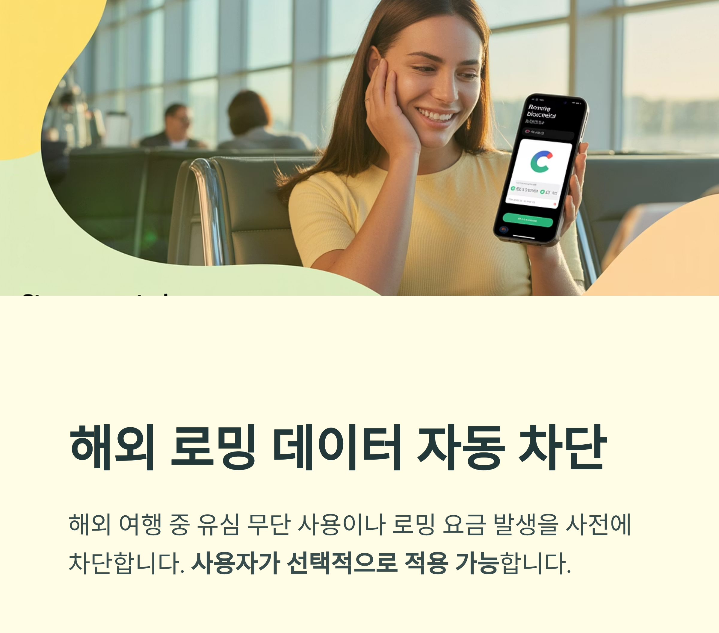 해외 여행 중 유심이 무단 사용되거나, 로밍 요금이 발생하는 것을 사전에 차단할 수 있습니다. 해외 로밍 차단 기능은 사용자가 선택적으로 적용 가능하며, 설정만으로도 원치 않는 요금 부과를 막을 수 있습니다.
