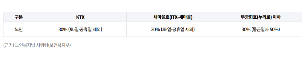 열차별로 노인할인 달라서 확인 필요합니다. KTX, 무궁화호, 새마을호마다 각각의 장단점이 있더군요.